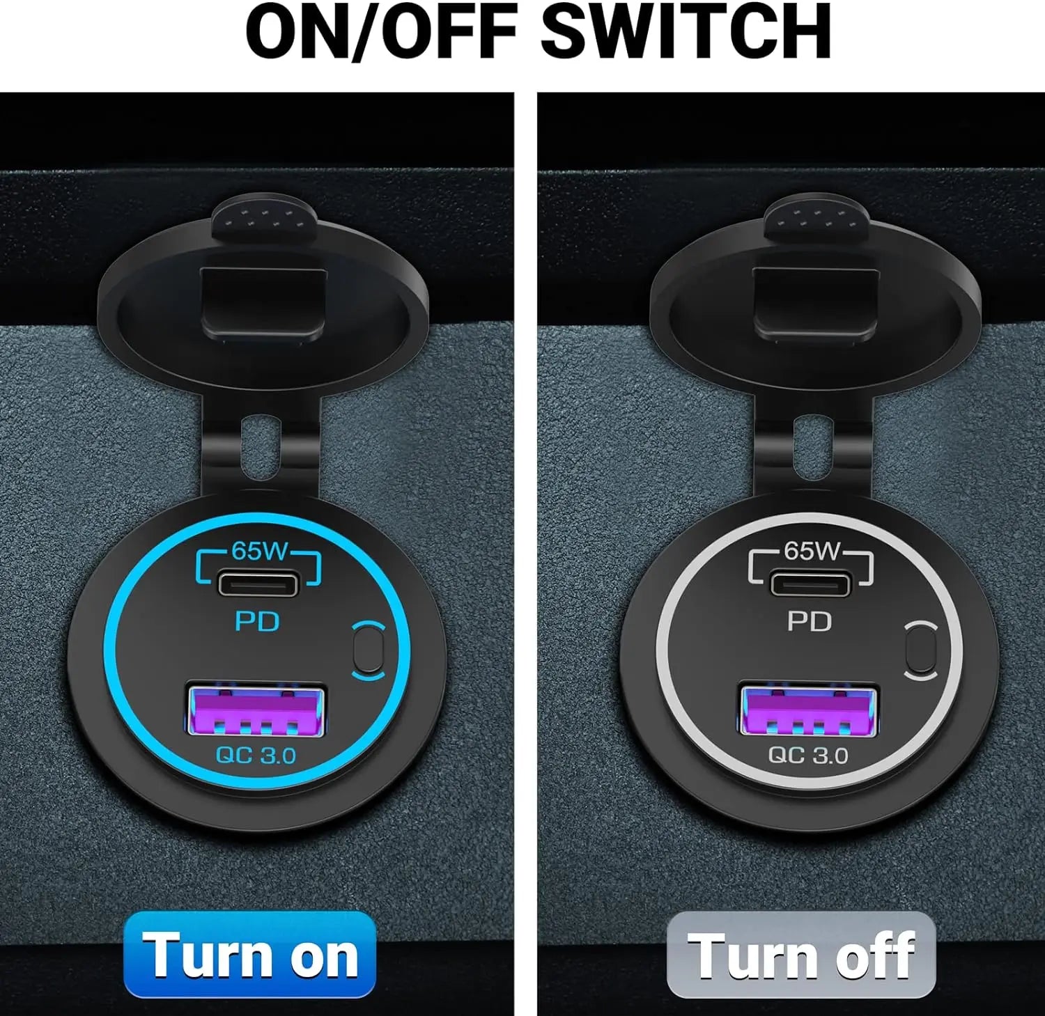 12V Dual USB Car Charger Waterproof Socket PD and QC 3.0 Fast Charging Port Power Outlet with Power Switch For RV Car
