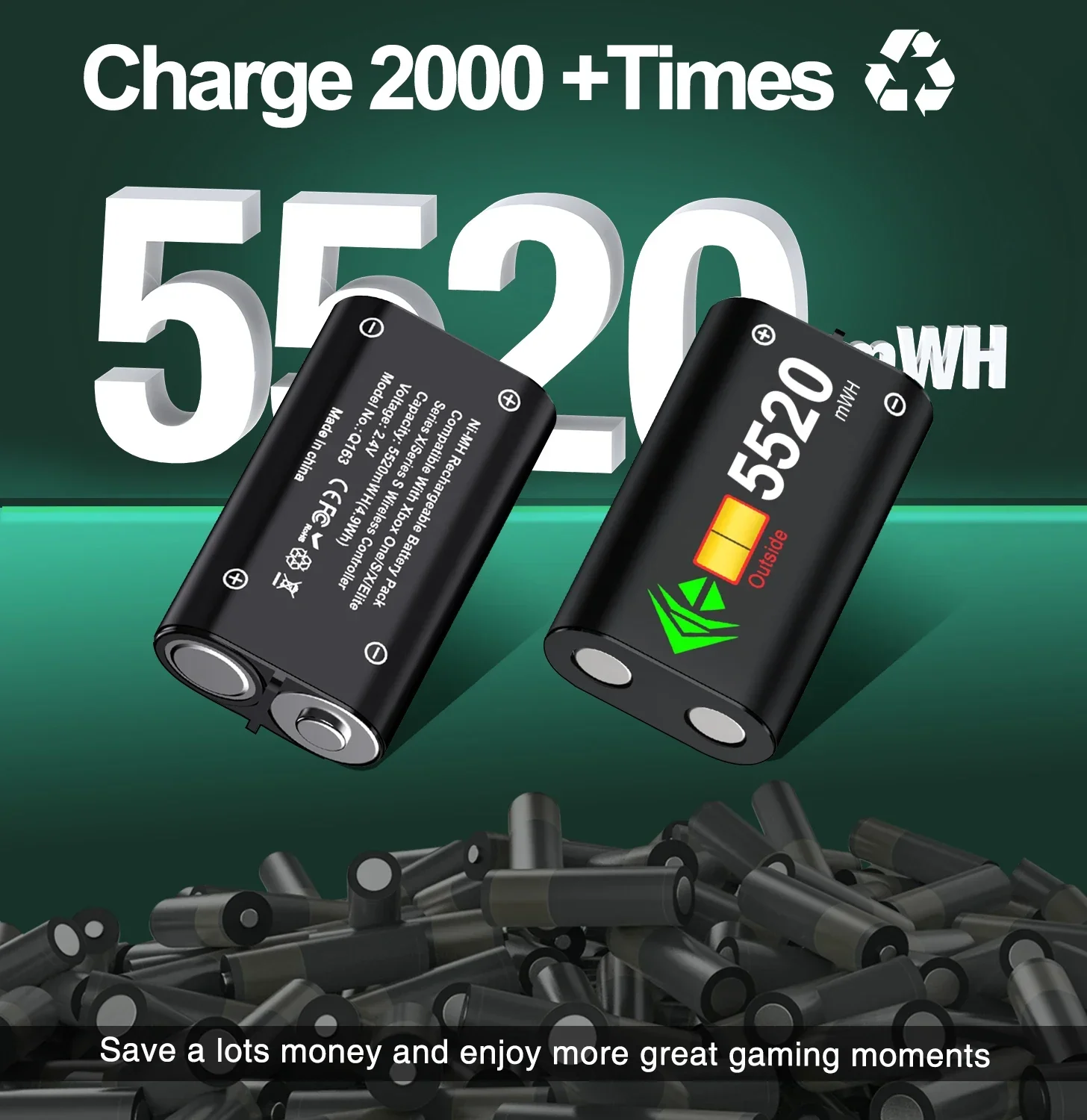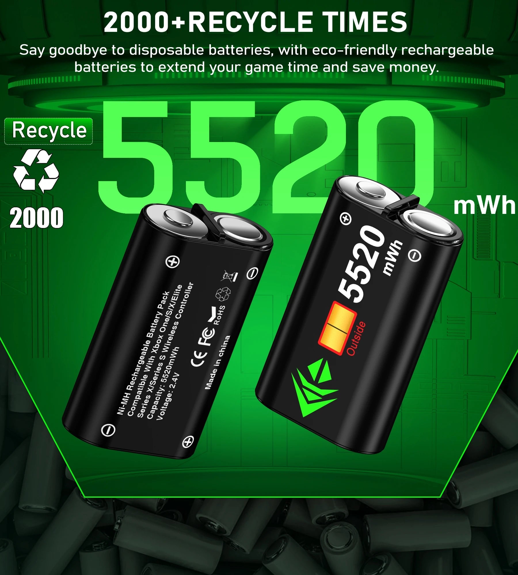 【Rechargeable Battery Pack for Xbox Series X/S/ Xbox One X / S / Xbox One/ Elite】Max capacity 2 x 5520mWh Xbox one controller rechargeable battery pack for Xbox one controller provides you 18-25hrs long playing time, and it only takes 4-5hrs charging time. You will never worried about interrupting game session, just grap xbox controller to enjoy your gaming time