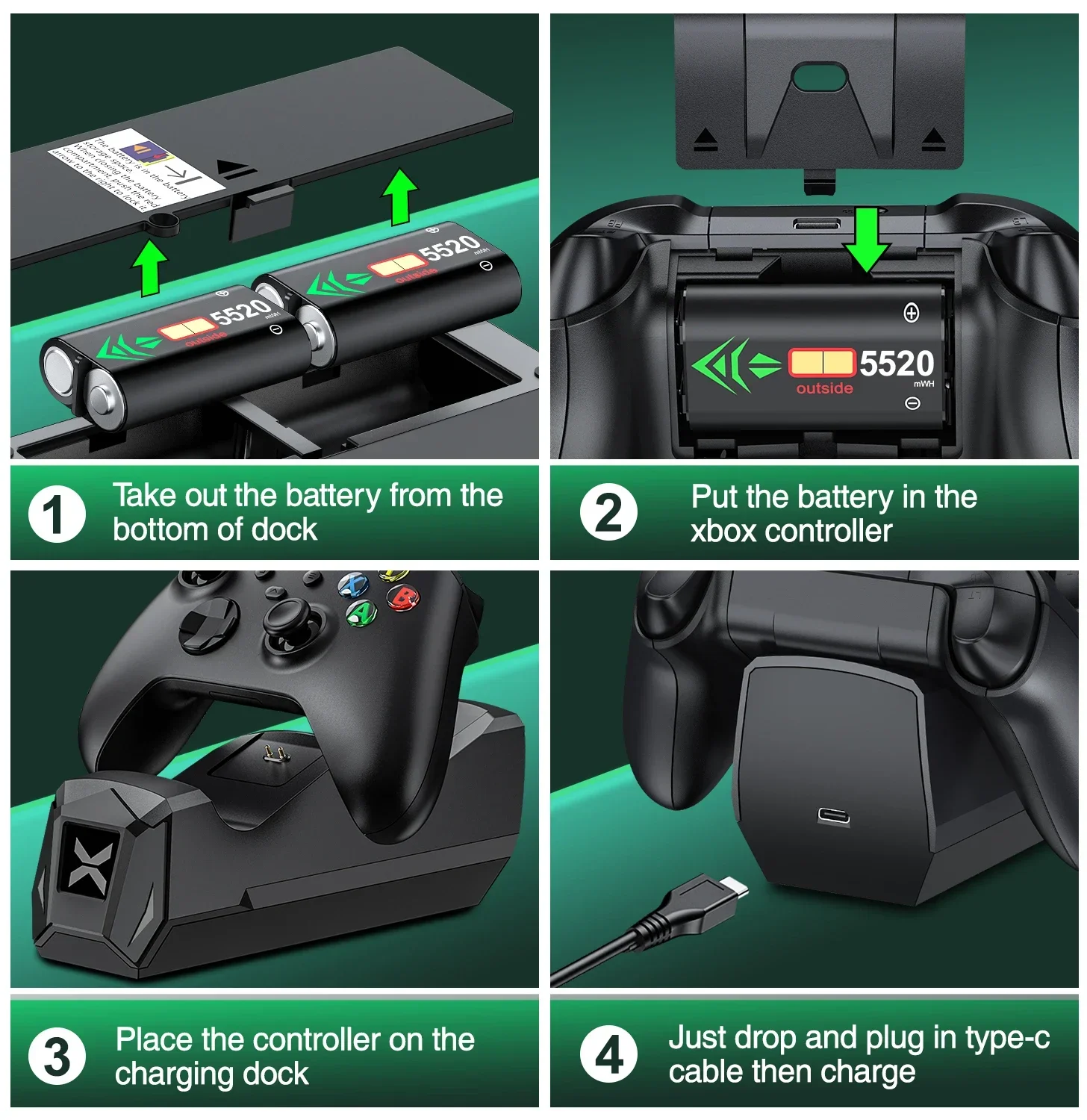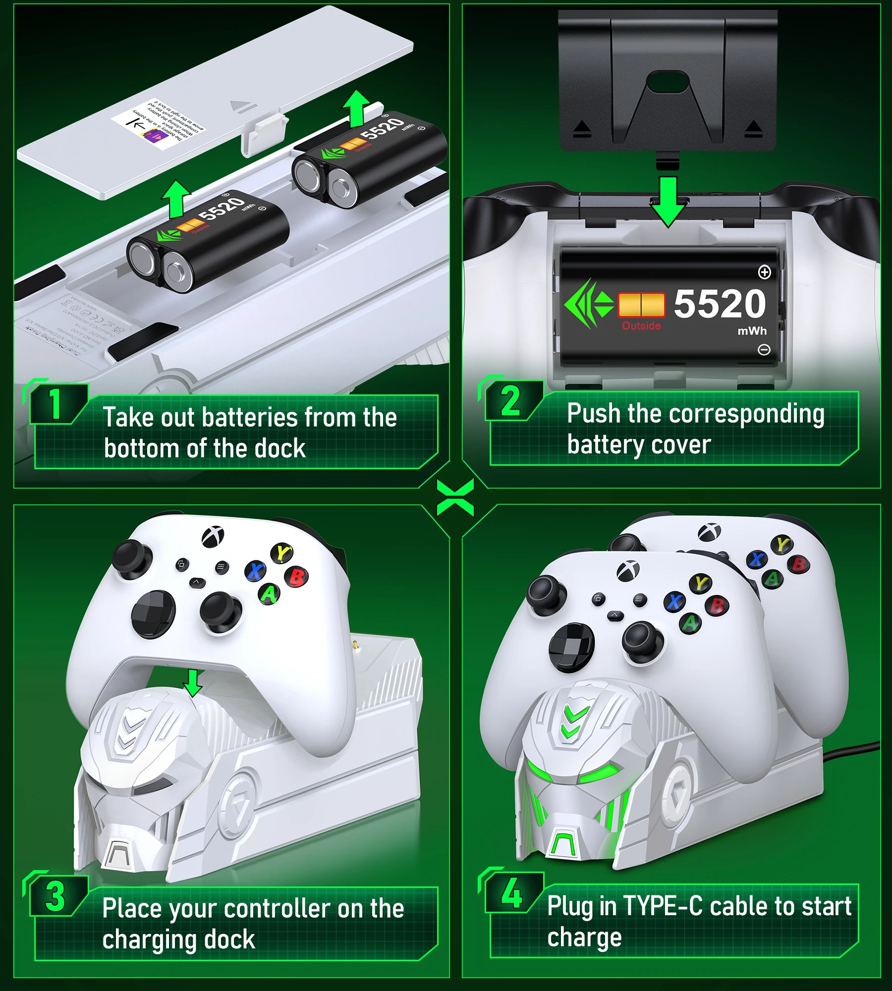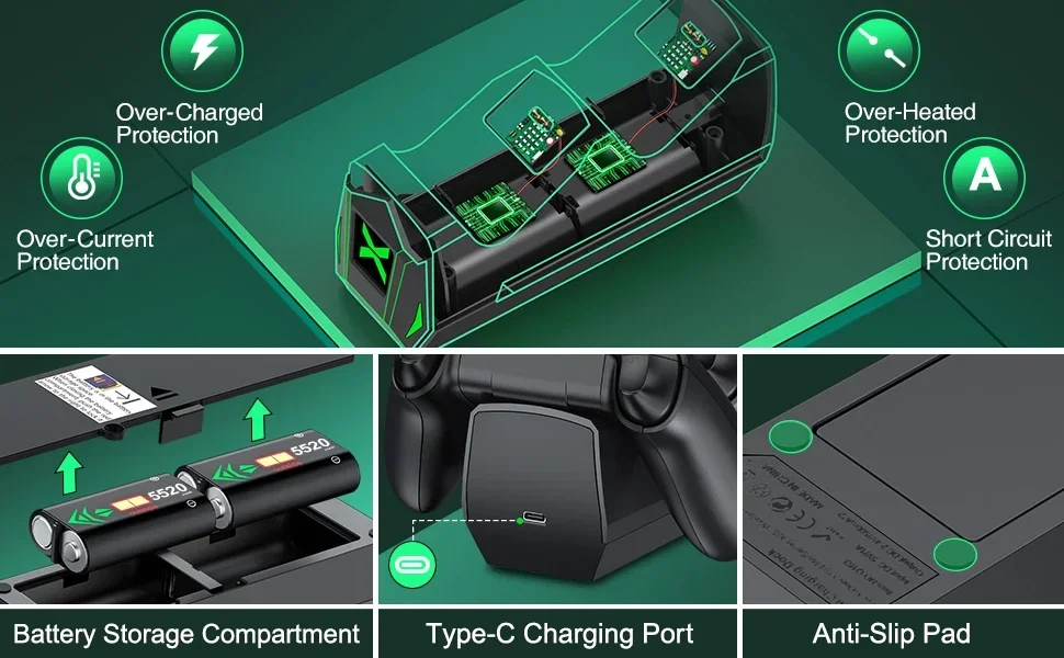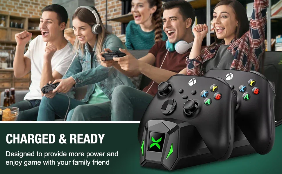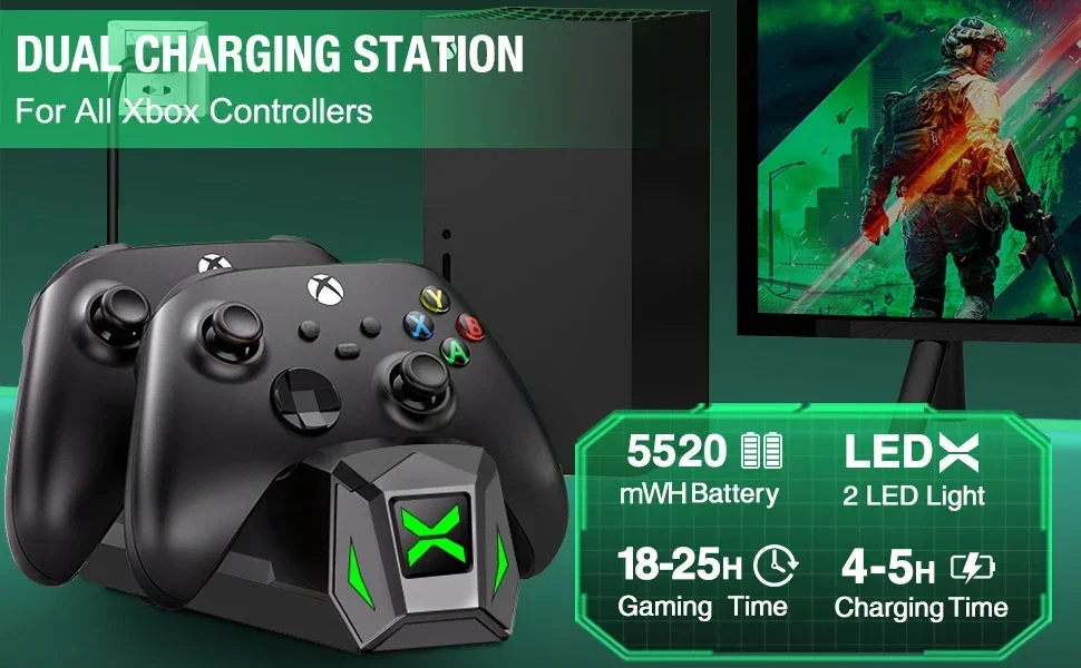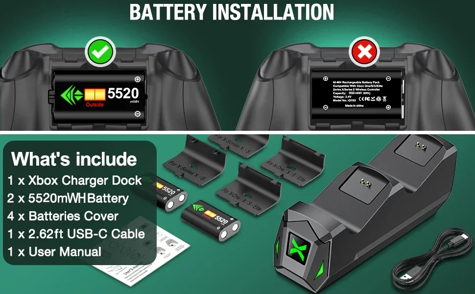 【Easy to Use and What You Get 】Just plug and charge. The dual-controller charging stand for Xbox series s/x provides you with a convenient and comfortable way to store and charge your Xbox controllers, giving you a better gaming experience. What you get: 2 X5520 mWh Xbox one rechargeable battery, 1 X Charger Dock for Xbox series x rechargeable battery pack, 1 X USB C charging cable, 1 X User Manual