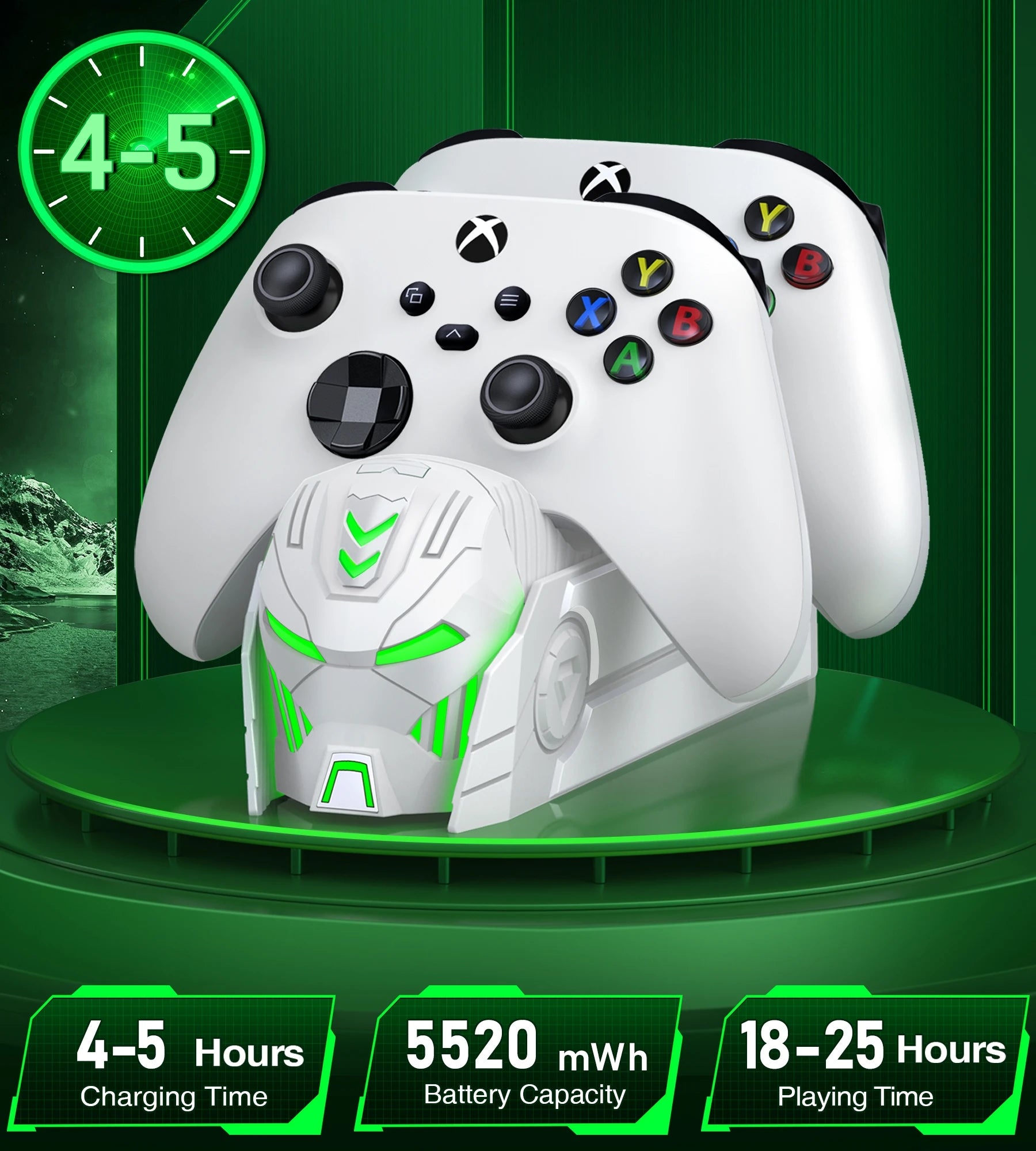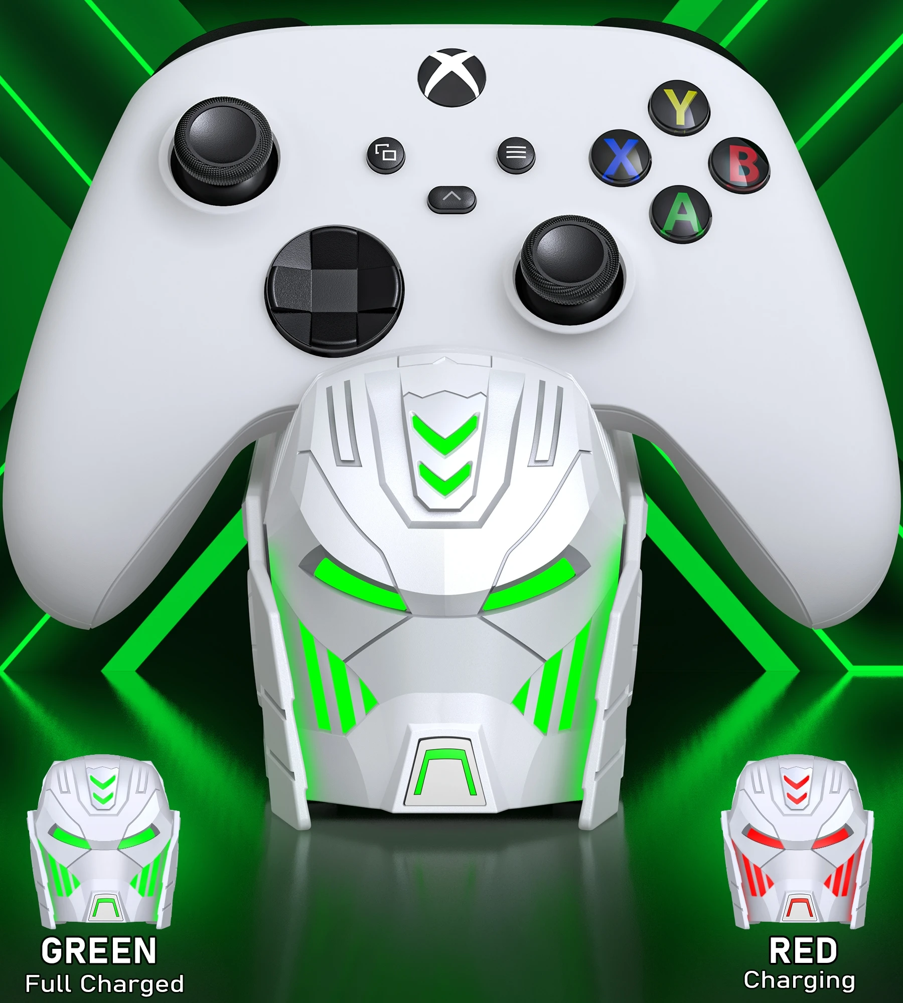 【Cool Design】With its Robot helmet-inspired aesthetic, immerse yourself in the world of superheroes as you recharge your controllers and prepare for epic gaming battles ahead. The xbox one controller charging dock features cool LED ambient light. The touch button allows you to control the LED light, with mode of ambient light available: red-color breath light when charging, solid green light when fully charged and LED off mode
