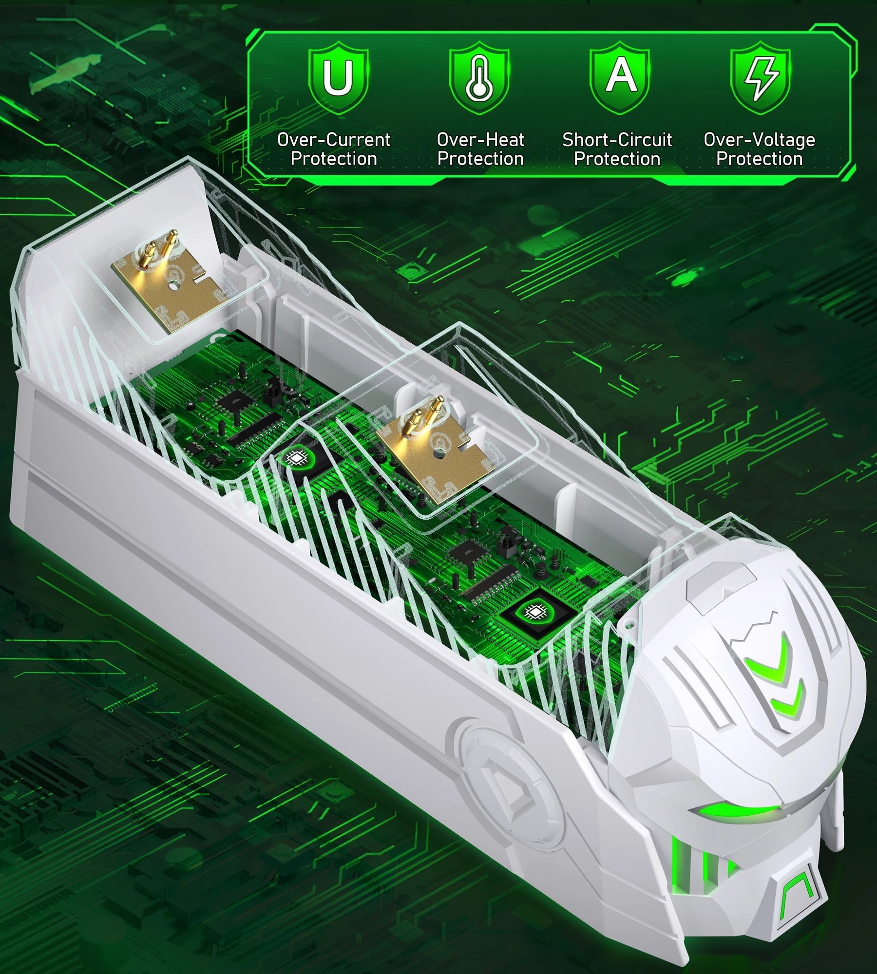 【Clear Individual LED indicators】 Arrow LED in the top of the Robot helmet clearly indicates the charging status. GREEN Light: standby or fully charged, and Red LED : charging. The touch button allows you to control the LED light. Built with an intelligent charging board that provides the charging dock with overheating and short circuit protection to extend the battery life and make battery to be recharged up to 2000 times