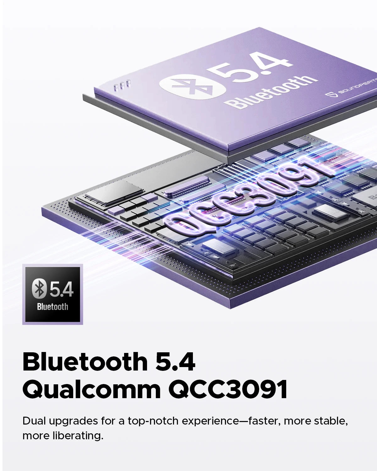 3. Bluetooth 5.4, QCC3091 Chip Equipped with the advanced QCC3091 Bluetooth 5.4 chip, the dual upgrade provides a top-notch audio and connectivity experience. Complex environments or long-distance connections remain stable and smooth, while power consumption is further reduced, extending the life of the earphones.