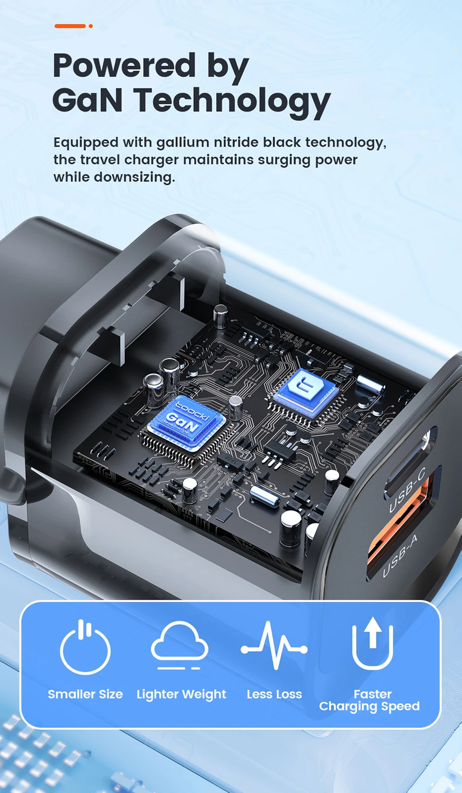 • GaN Technology :The charger uses GaN technology, which makes it smaller and more efficient than traditional chargers.