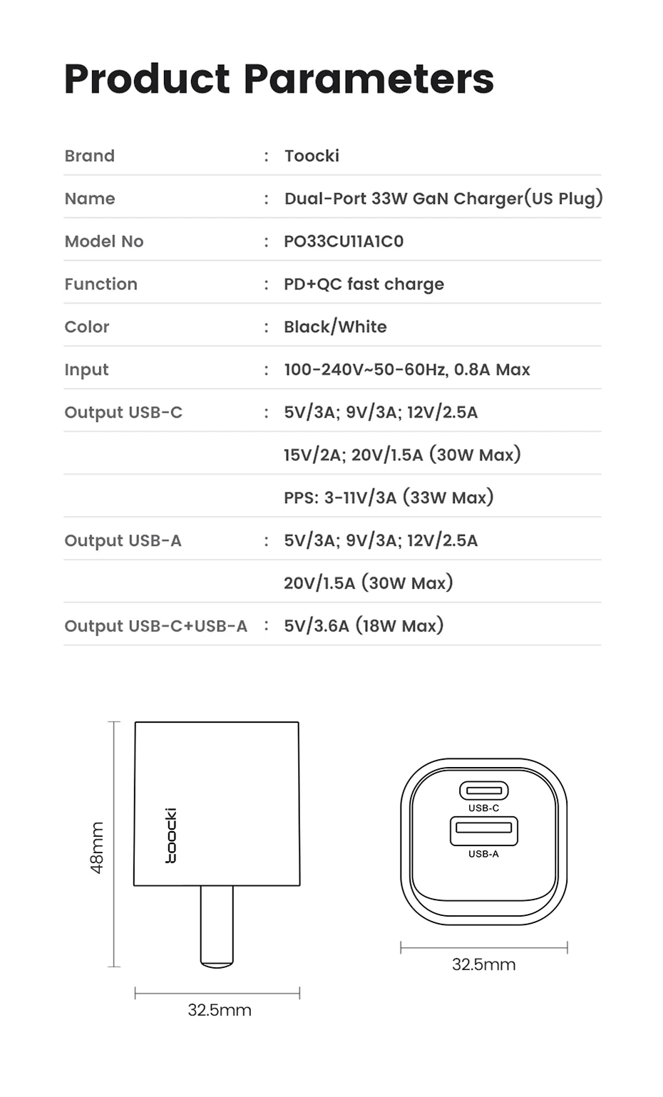 USB-C Output: 5V/3A; 9V/3A; 12V/2.5A; 15V/2A; 20V/1.5A (30W Max.) PPS: 3-11V/3A (33W Max.)